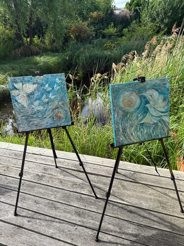 Autorský set dvou akrylových pláten zachycuje motýla a ptáčka jako symboly proměny a volnosti ducha. Jemná barevná paleta v tónech modrého nebe vytváří harmonický most mezi křehkostí a silou.