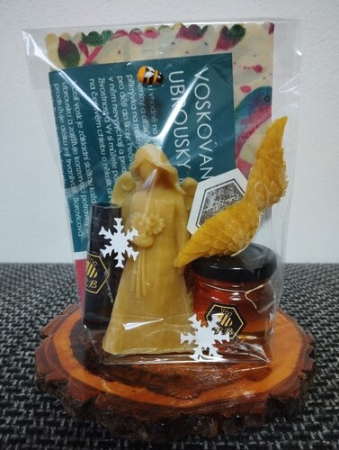 sada: ručně vyrobená svíčka anděla, květový med z vlastní včelnice 50g, voskovaný ubrousek na potraviny (30x30cm), balzám na rty s propolisem a andělská křídla jako symbol bezpečí a ochrany, autorka: Radka Bordovská, Svinov