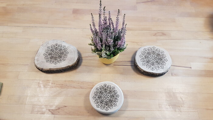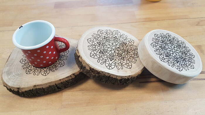 Představujeme s láskou a ručně vyráběný set - tři podložky pod hrnec z jasanového dřeva o průměru 14cm, 16cm a 18cm. Podložky jsou oboustranné, z jedné strany jsou zdobeny mandalou, druhá strana je ponechána přírodní.
