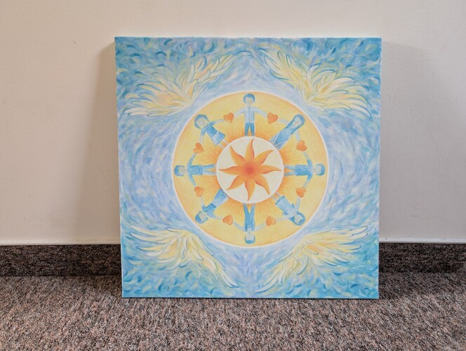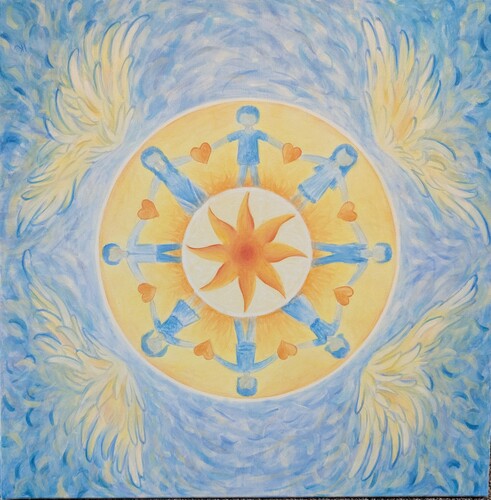 Obraz namalovala naše úžasná výtvarnice Ivetka v rámci kreativních workshopů organizace ABC, o.p.s., která podporuje rodiny dětí s autismem. Dílo nese silný symbolický význam – děti držící se v kruhu chrání rozprostřená křídla, což vyjadřuje bezpečí, jednotu a vzájemnou podporu.