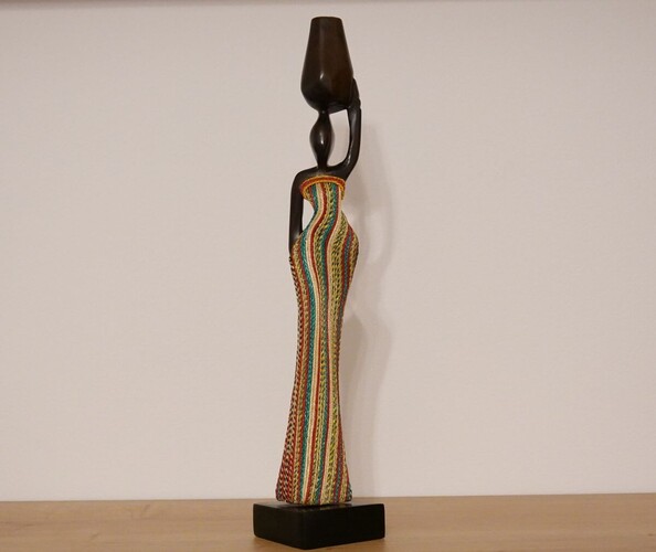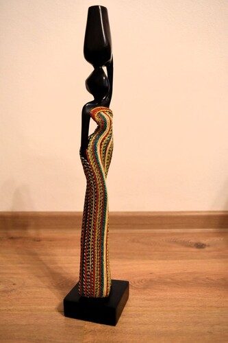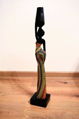 Ručně vyřezávaná soška zachycuje krásu a sílu africké ženy, která na hlavě nese nádobu s vodou – symbolem života a péče o společenství. Je nádherná, od ladné siluety po pestře malované šaty, odráží kulturu, tradici a zručnost místních řemeslníků a umělců.