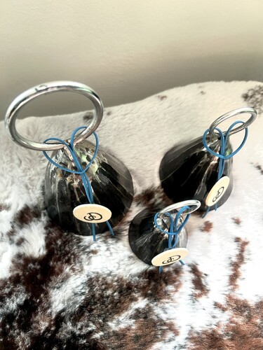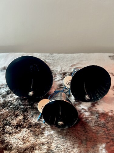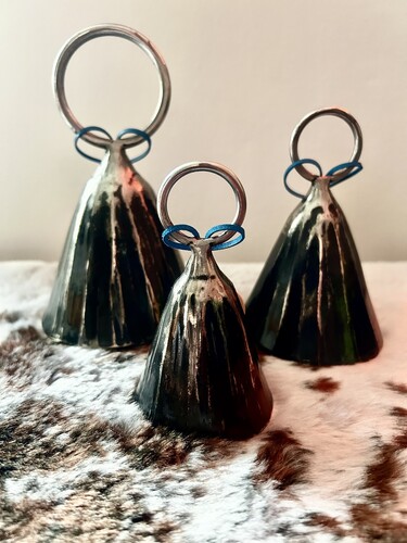 Set 3 originálních kovaných zvonků, rozměry: malý – průměr 6 cm, výška 12 cm, střední – průměr 8 cm, výška 14 cm, velký – průměr 9 cm, výška 16 cm